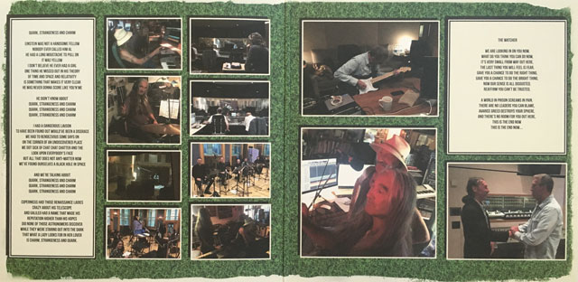 ジャケットは見開きでした。とてもホークウインドのジャケには見えないイラスト。左上に小さくエリック・クラプトンも描かれ、現メンバー全員と今作で重責を担ったマイク・バットも載っています。コーティングやツヤのないマットな紙質で朴訥なイラストと相まって、アコースティック感のあるもの。内側には制作の様子を撮ったスナップ写真が掲載。クラプトンの写真が多いですね。演奏しているギターはクラプトン定番のストラトです。ジャケ裏側にはクレジット。ホークスのアルバムにクラプトンのクレジットってすごい違和感。以前ギグに参加していたジェズ・ハジェットの名前も。絃楽器、管楽器のミュージシャンのクレジットは載っていませんが、スナップを見ると、バットが話していたように弦楽五重奏、サックス五重奏の編成が見られます。これに加えてフルートやクラリネットやオーボエなどのホーンセクションが参加しています。