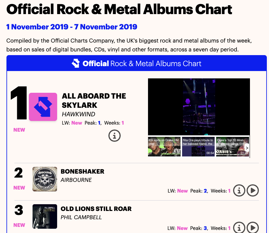10月下旬にリリースされた最新作ALL ABOARD THE SKYLARKですが、11月1日週のUK OFFICIAL CHARTにおいて34位をマークしました。ROCK & METAL ALBUMS部門では1位ですね!ここ数年のチャート状況は2016年のTHE MACHINE STOPSの29位、17年のINTO THE WOODSの34位。今作もTOP40圏内という結果で中堅どころの安定感をキープしています。