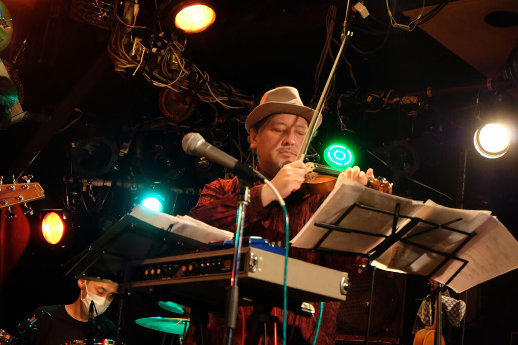 最後は2バンドフルメンバーでAD2の「ドイツ・ネパール」が演奏され、トリはホークスの「ハシシ」を演ってくれました。続木さんのとても表情の豊かなバイオリンはここでは、原曲の激しい演奏を再現しつつ、伸びやかに演奏されていました。リード楽器はバイオリンに加え園丁さんのオーボエも加わり、ボーカルは二人の女性ボーカルという新機軸。SUBWAY TO SALLYのMephistoのカバーは日本初かもということでしたが、Hassan I Sahbaも初だと思います。原曲の高揚感がこの編成ならではのものに昇華されていました。先生のAD2やホークス、はたまた昭和歌謡への愛情が感じられる素敵なステージでした。
