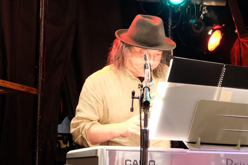 今回は千尋先生からお誘いをいただき、ホークス曲もやられるとのことでした。ハシシとのことで、ちょうど当サイトでサイモン・ハウス特集を掲載したばかりでした。5月15日、吉祥寺のシルバー・エレファント。会場は満員御礼。2つのバンド、LACRYMOSA PAGANとまぼろしペイガンズの2部構成のステージで、最後には全員での演奏となりました。LACRYMOSAには私の高校時代からの友人、園丁さんが出演することもあり楽しみにしていました。ドラマーの吉江潤也さん、ボーカルは未藍千紗さんで4名。LACRYMOSA時代の3曲を再演をされました。Random Accessの演奏は中間の即興パートから後半へのテーマの繋がり、Wreck Again IIの強烈変拍子など聴きどころ満載でした。園丁さんのイングリッシュホルンのトリビアも初めて聞いた話で面白かったです。