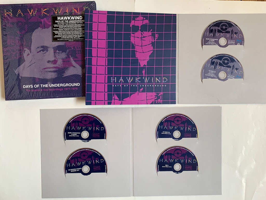 ホークウインドの未発表トラック含む注目の10枚ディスクセット、DAYS OF THE UNDERGROUNDを入手しました。改めてディスクレビューしますが、まずは速報です。チェリー・レッドのボックスセットということで、従来のようなクラムシェルのボックスかと予想していましたが、一辺25cmもある大きめのボックスで気合を感じます。